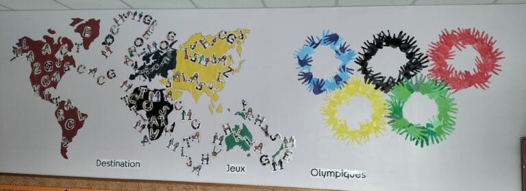 Chaque année, les élèves du primaire réalisent collectivement une fresque murale en lien avec le thème de l’année. Celle-ci est affichée dans le hall d’entrée de l’école. Cette année, notre